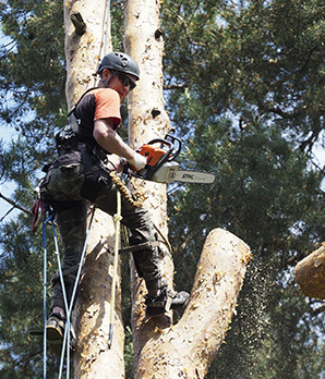 Применяют, если есть ограничения в условиях. Арборист работает на высоте, проводит обвязку и натягивает трос. Затем наносит распилы, и приступает к сбросу веток или их спуску на веревках. Перед этим проводится расчистка участка.